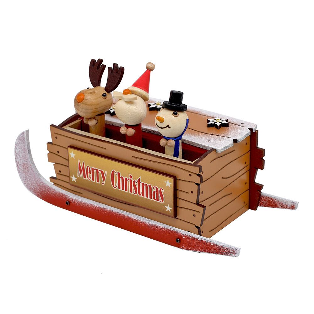 サンタさん、トナカイさん、雪だるま君が乗って楽しく滑るソリをイメージしたからくりオルゴールです